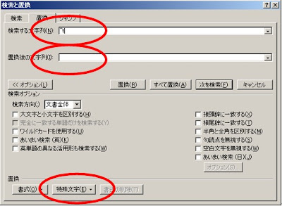 「検索する文字列」にカーソルを置き、「特殊文字」の中から「タブ文字」を選択します。(「検索する文字列」の中に「^t」と入ります。「特殊文字」の中から「タブ文字」を選択する代わりに、直接「^t」と入力してもいいです。)